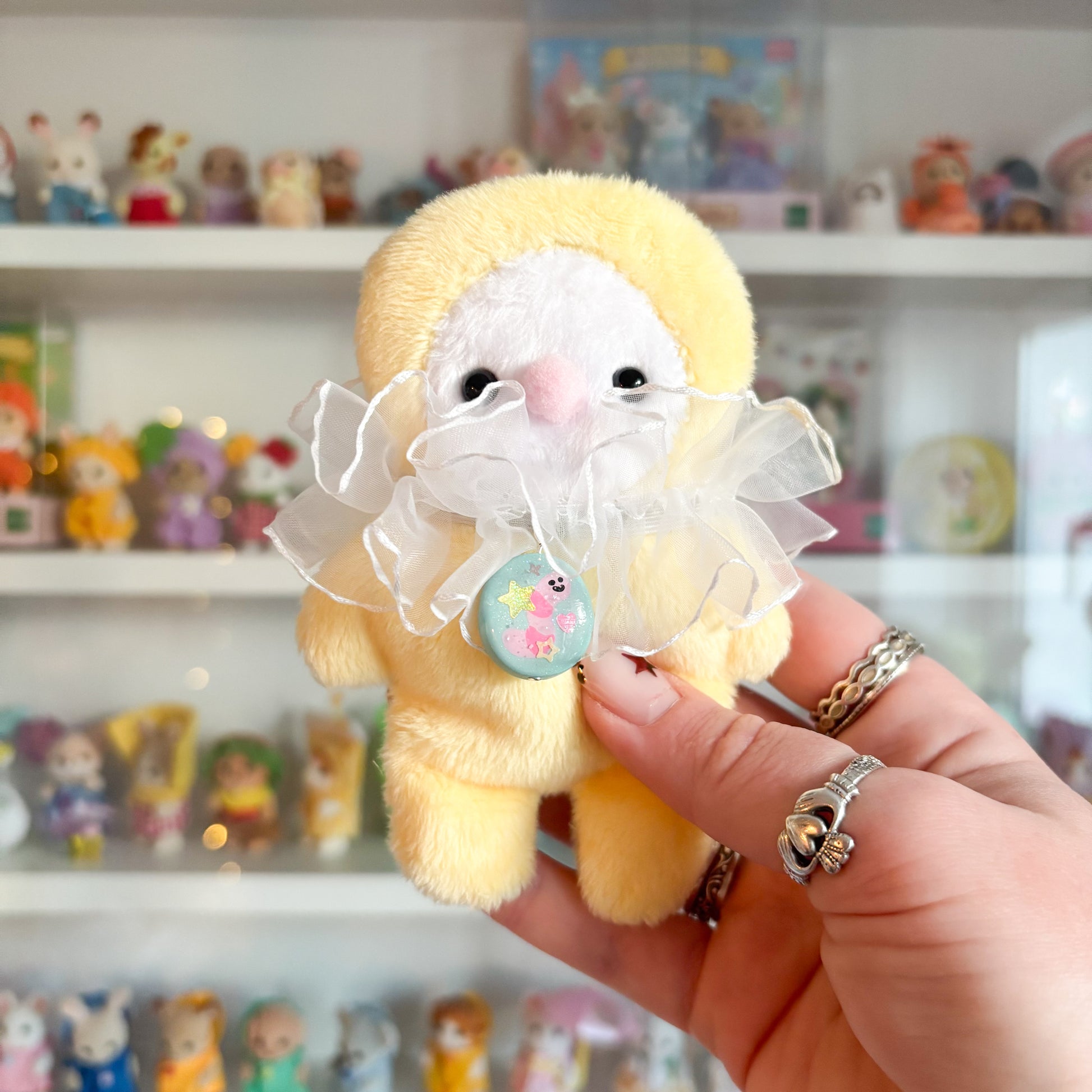 Each plushie features patterned fabrics, handmade clay charms, and custom buttons designed by Sun Puff Studios. Limited edition and exclusive! 💖✨