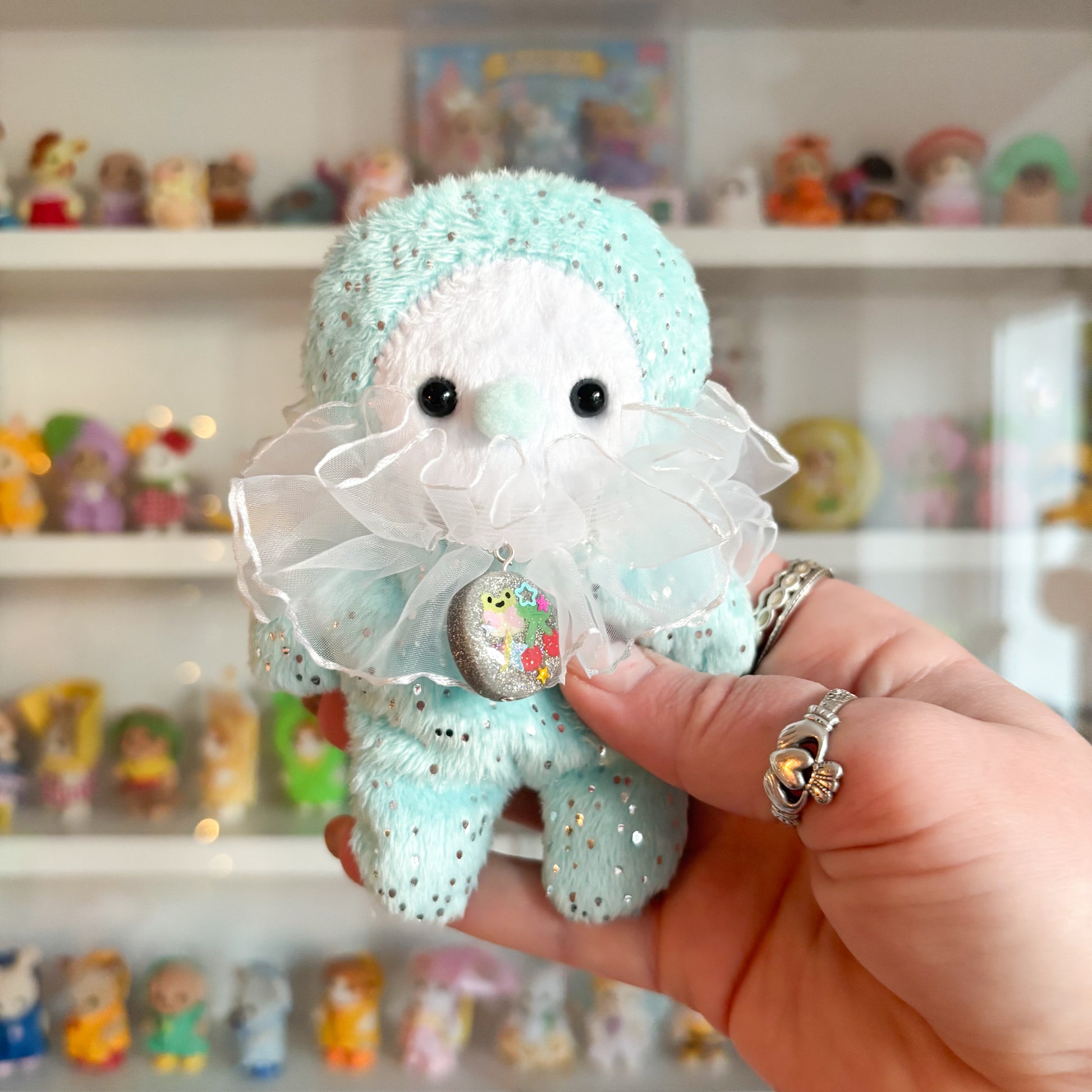 Each plushie features patterned fabrics, handmade clay charms, and custom buttons designed by Sun Puff Studios. Limited edition and exclusive! 💖✨